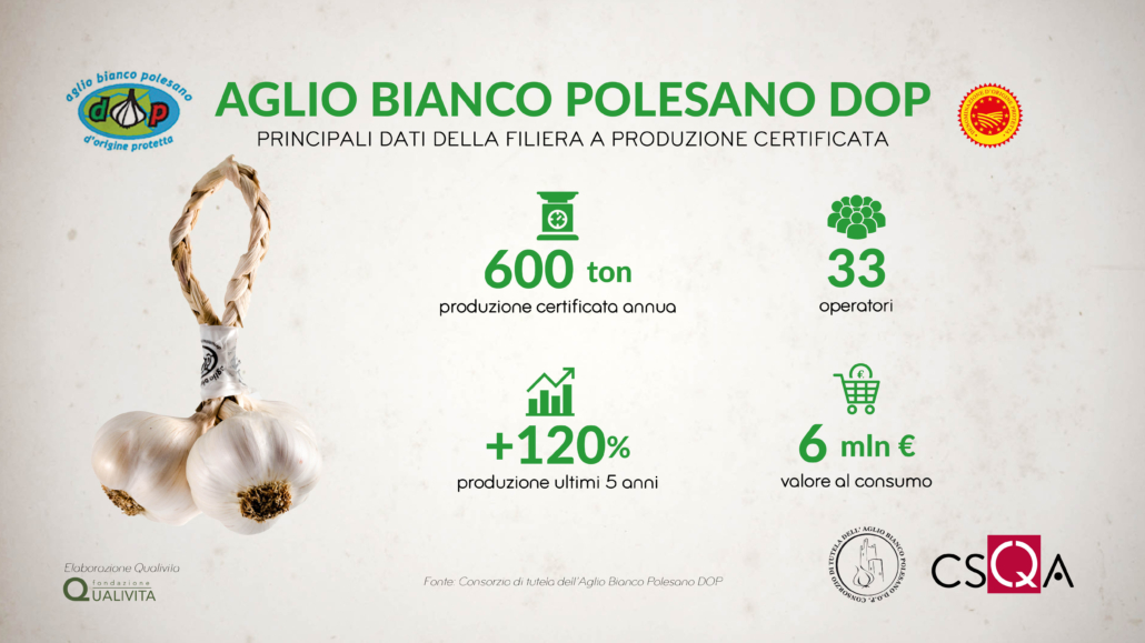 La DOP Aglio Bianco Polesano conferma il valore del portfolio di prodotti DOP IGP certificato da CSQA, che conta ad oggi 73 Indicazioni Geografiche: un dato che sottolinea la volontà di accompagnare sempre di più lo sviluppo delle filiere agroalimentari di qualità, simbolo del made in Italy e della vocazione dei territori.